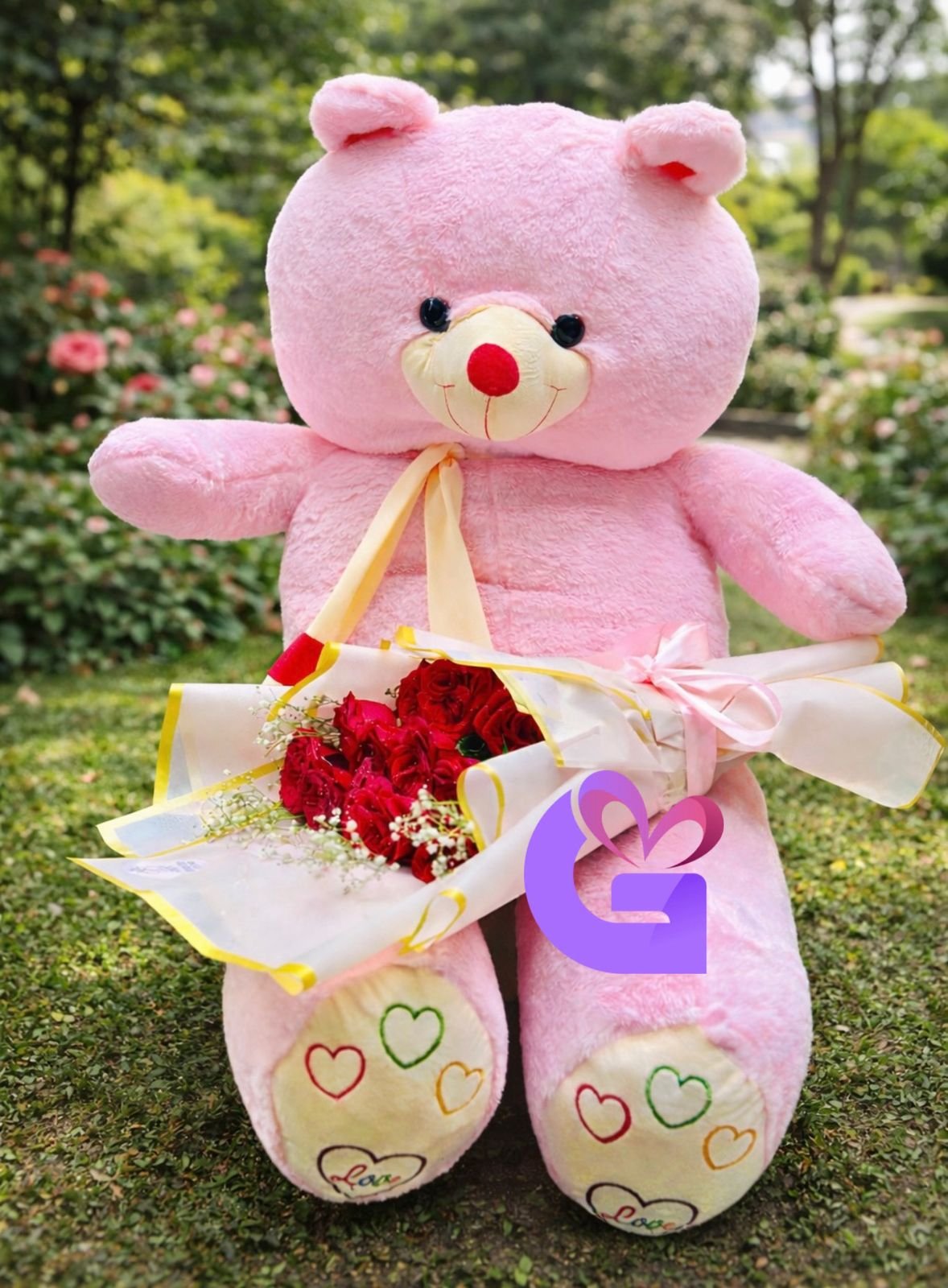 Express your love in the sweetest way with this adorable pink teddy bear gift set. The soft and cuddly teddy comes holding a beautiful bouquet of fresh red roses, elegantly wrapped with premium paper and ribbon. Its cute design, heart-patterned paws, and gentle smile make it a perfect symbol of love and affection.